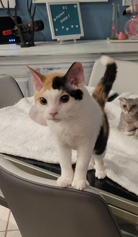 . Look at pictures of Calico kittens who need a home. Uses the cat litter eats solids. Ask group about this pet.